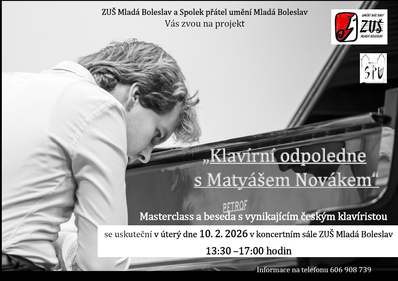 10.2.2026 (úterý) od 13:30 do 17 hodin v koncertním sále ZUŠ Mladá Boleslav se uskuteční masterclas "Klavírní odpoledne s Matyášem Novákem".Aktivními účastníky budou vybraní žáci – klavíristé – ZUŠ, pasivními účastníky může být kdokoli má zájem, tedy i vy a vaši známí. Jste školou srdečně zváni, přicházet a odcházet ohleduplně je možno volně...